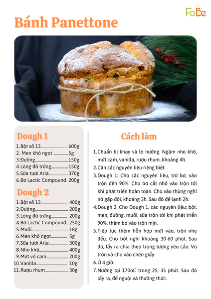| DOUGH 01 1. Bột mì số 13: 600g 2. Men khô ngọt: 5g 3. Đường: 150g 4. Lòng đỏ trứng gà: 150g 6. Sữa tươi tiệt trùng nguyên kem 3,5% béo hiệu Arla: 370g 7. Bơ Lactic Compound: 200g DOUGH 02 1. Bột mì số 13: 500g 2. Đường: 200g 3. Lòng đỏ trứng gà: 200g 4. Muối: 18g 5. Men khô ngọt: 5g 6. Sữa tươi tiệt trùng nguyên kem 3,5% béo Arla: 300g 7. Bơ Lactic Compound: 250g 8. Nho khô 400g 9. Mứt vỏ cam: 200g 10. Vanilla: 10g 11. Ruouj rhum: 30g |